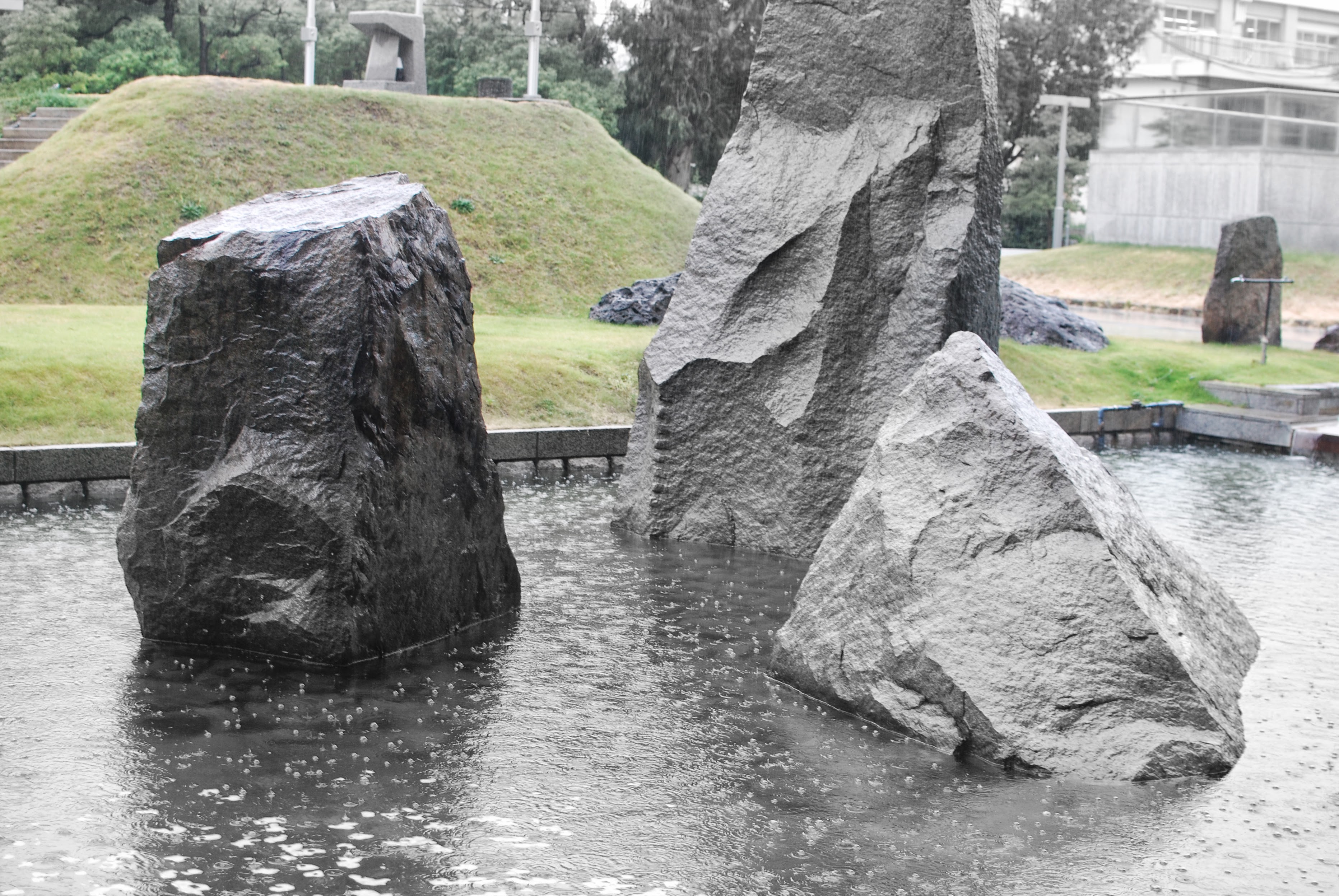 「豊穣のシンボル」として選ばれた県産の庵治石は、丁場から半日がかりで現場に運ばれ、池にすえられました。