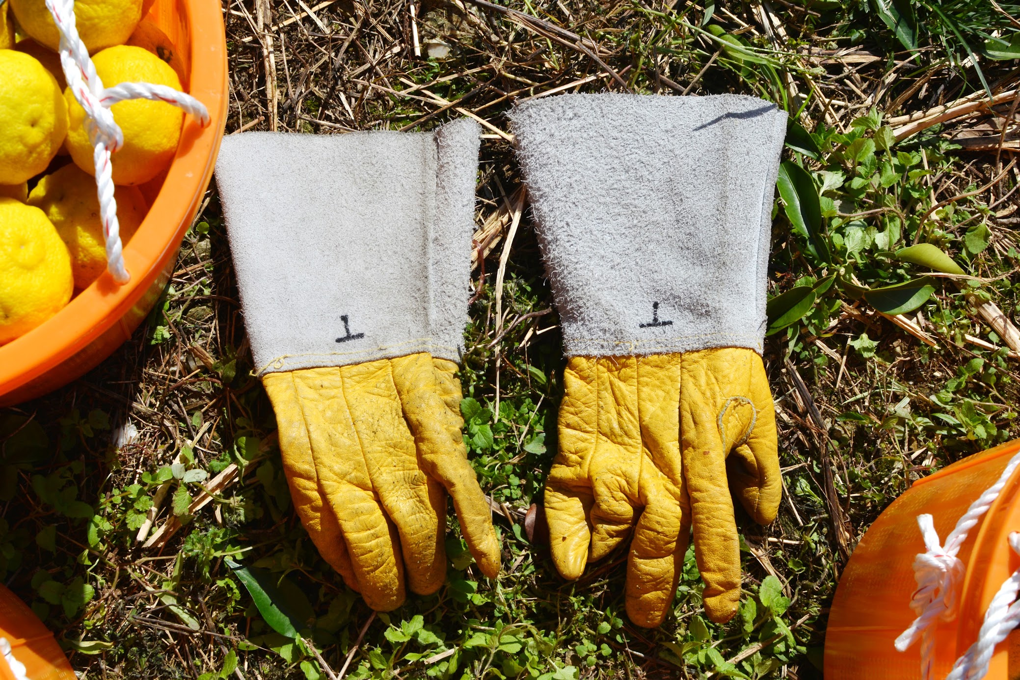 柚子収穫用の手袋。柚子はトゲがとても長く鋭いので、危険な収穫作業に手を守ってくれる特殊な保護手袋をつけます。日本の手袋製造のシェア90%以上を誇る香川県東かがわ市でつくられています。